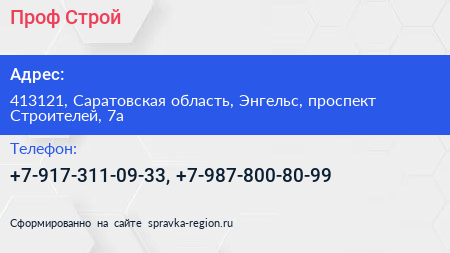 Проф-Строй по адресу 413121, Саратовская область, Энгельс, проспект Строителей, 7а в дальнейшем Организация, размещена в следующих категориях: