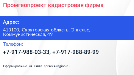 Промгеопроект, кадастровая фирма по адресу 413100, Саратовская область, Энгельс, Коммунистическая, 49 в дальнейшем Организация, размещена в следующих категориях: