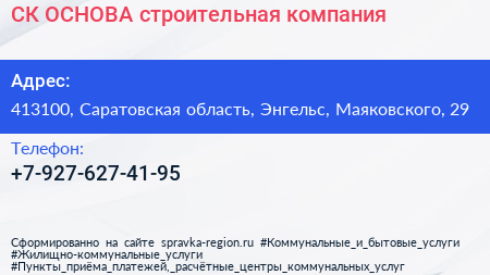 СК ОСНОВА, строительная компания по адресу 413100, Саратовская область, Энгельс, Маяковского, 29 в дальнейшем Организация, размещена в следующих категориях: