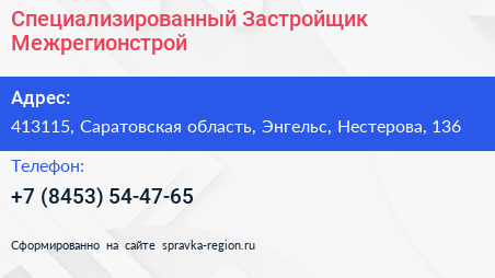 Специализированный Застройщик Межрегионстрой по адресу 413115, Саратовская область, Энгельс, Нестерова, 136 в дальнейшем Организация, размещена в следующих категориях: