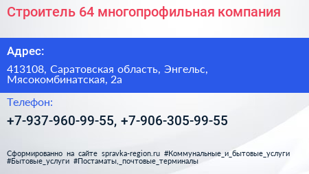 Строитель.64, многопрофильная компания по адресу 413108, Саратовская область, Энгельс, Мясокомбинатская, 2а в дальнейшем Организация, размещена в следующих категориях: