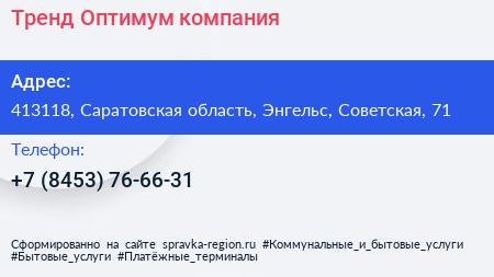 Тренд-Оптимум, компания по адресу 413118, Саратовская область, Энгельс, Советская, 71 в дальнейшем Организация, размещена в следующих категориях: