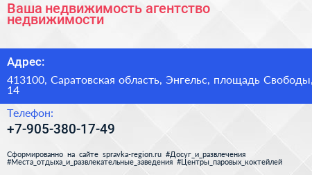 Ваша недвижимость, агентство недвижимости по адресу 413100, Саратовская область, Энгельс, площадь Свободы, 14 в дальнейшем Организация, размещена в следующих категориях: