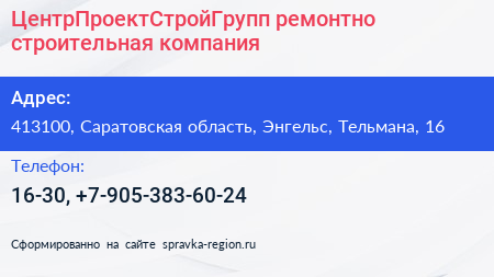 ЦентрПроектСтройГрупп, ремонтно-строительная компания по адресу 413100, Саратовская область, Энгельс, Тельмана, 16 в дальнейшем Организация, размещена в следующих категориях: