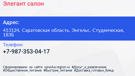 Элегант, салон по адресу 413124, Саратовская область, Энгельс, Студенческая, 183Б в дальнейшем Организация, размещена в следующих категориях: