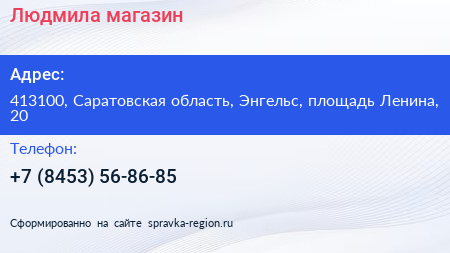 Людмила, магазин по адресу 413100, Саратовская область, Энгельс, площадь Ленина, 20 в дальнейшем Организация, размещена в следующих категориях: