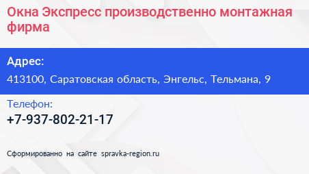 Окна Экспресс, производственно-монтажная фирма по адресу 413100, Саратовская область, Энгельс, Тельмана, 9 в дальнейшем Организация, размещена в следующих категориях: