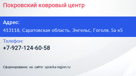Покровский ковровый центр по адресу 413118, Саратовская область, Энгельс, Гоголя, 5а к5 в дальнейшем Организация, размещена в следующих категориях: