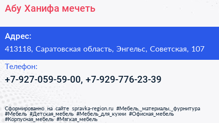 Абу Ханифа, мечеть по адресу 413118, Саратовская область, Энгельс, Советская, 107 в дальнейшем Организация, размещена в следующих категориях: