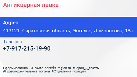 Антикварная лавка по адресу 413121, Саратовская область, Энгельс, Ломоносова, 19а в дальнейшем Организация, размещена в следующих категориях: