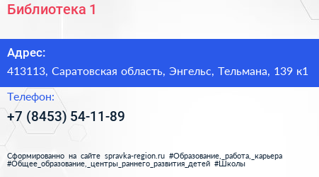 Библиотека №1 по адресу 413113, Саратовская область, Энгельс, Тельмана, 139 к1 в дальнейшем Организация, размещена в следующих категориях: