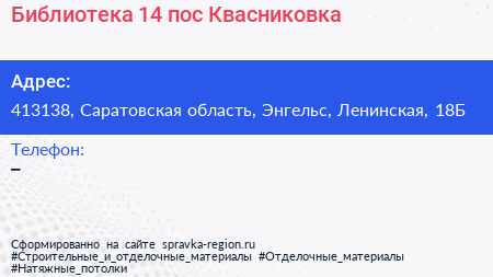 Библиотека №14, пос. Квасниковка по адресу 413138, Саратовская область, Энгельс, Ленинская, 18Б в дальнейшем Организация, размещена в следующих категориях: