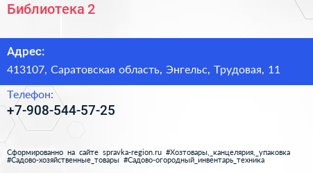 Библиотека №2 по адресу 413107, Саратовская область, Энгельс, Трудовая, 11 в дальнейшем Организация, размещена в следующих категориях: