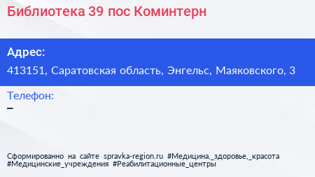 Библиотека №39, пос. Коминтерн по адресу 413151, Саратовская область, Энгельс, Маяковского, 3 в дальнейшем Организация, размещена в следующих категориях: