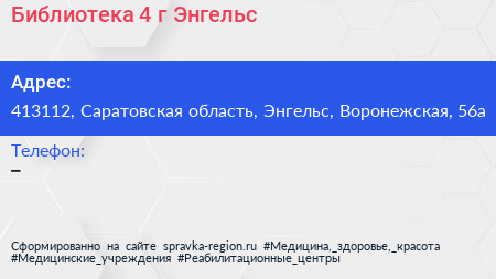 Библиотека №4, г. Энгельс по адресу 413112, Саратовская область, Энгельс, Воронежская, 56а в дальнейшем Организация, размещена в следующих категориях: