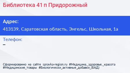 Библиотека №41, п. Придорожный по адресу 413139, Саратовская область, Энгельс, Школьная, 1а в дальнейшем Организация, размещена в следующих категориях: