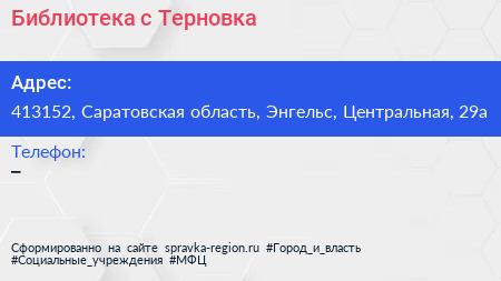 Библиотека, с. Терновка по адресу 413152, Саратовская область, Энгельс, Центральная, 29а в дальнейшем Организация, размещена в следующих категориях: