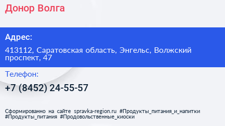 Донор Волга по адресу 413112, Саратовская область, Энгельс, Волжский проспект, 47 в дальнейшем Организация, размещена в следующих категориях: