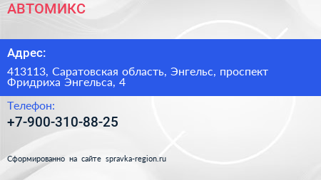 АВТОМИКС по адресу 413113, Саратовская область, Энгельс, проспект Фридриха Энгельса, 4 в дальнейшем Организация, размещена в следующих категориях:
