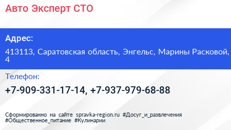 Авто Эксперт, СТО по адресу 413113, Саратовская область, Энгельс, Марины Расковой, 4 в дальнейшем Организация, размещена в следующих категориях: