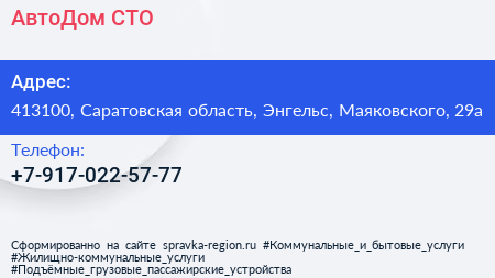 АвтоДом, СТО по адресу 413100, Саратовская область, Энгельс, Маяковского, 29а в дальнейшем Организация, размещена в следующих категориях: