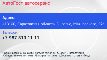 АвтоГост, автосервис по адресу 413100, Саратовская область, Энгельс, Маяковского, 29е в дальнейшем Организация, размещена в следующих категориях: