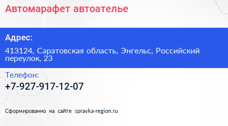 Автомарафет, автоателье по адресу 413124, Саратовская область, Энгельс, Российский переулок, 23 в дальнейшем Организация, размещена в следующих категориях:
