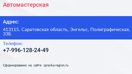 Автомастерская по адресу 413115, Саратовская область, Энгельс, Полиграфическая, 33Б в дальнейшем Организация, размещена в следующих категориях: