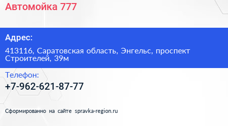 Автомойка 777 по адресу 413116, Саратовская область, Энгельс, проспект Строителей, 39м в дальнейшем Организация, размещена в следующих категориях: