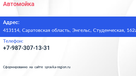 Автомойка по адресу 413114, Саратовская область, Энгельс, Студенческая, 162а в дальнейшем Организация, размещена в следующих категориях: