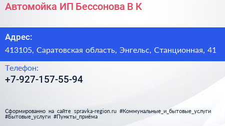 Автомойка, ИП Бессонова В.К. по адресу 413105, Саратовская область, Энгельс, Станционная, 41 в дальнейшем Организация, размещена в следующих категориях: