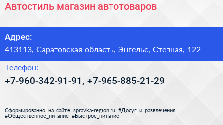 Автостиль, магазин автотоваров по адресу 413113, Саратовская область, Энгельс, Степная, 122 в дальнейшем Организация, размещена в следующих категориях: