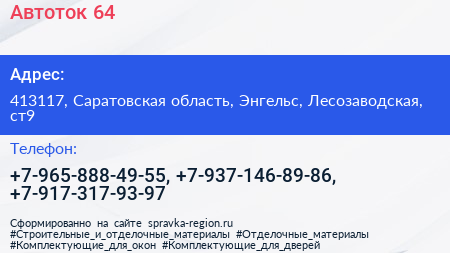 Автоток-64 по адресу 413117, Саратовская область, Энгельс, Лесозаводская, ст9 в дальнейшем Организация, размещена в следующих категориях: