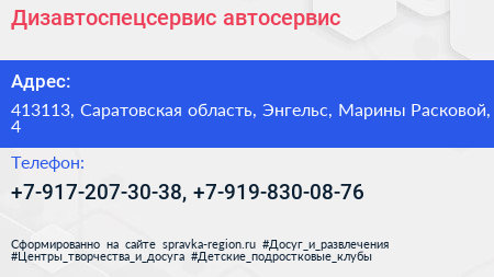 Дизавтоспецсервис, автосервис по адресу 413113, Саратовская область, Энгельс, Марины Расковой, 4 в дальнейшем Организация, размещена в следующих категориях: