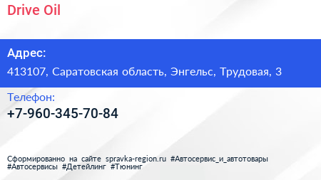 Drive Oil по адресу 413107, Саратовская область, Энгельс, Трудовая, 3 в дальнейшем Организация, размещена в следующих категориях: