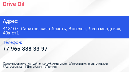 Drive Oil по адресу 413107, Саратовская область, Энгельс, Лесозаводская, 43а ст1 в дальнейшем Организация, размещена в следующих категориях: