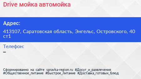 Drive мойка, автомойка по адресу 413107, Саратовская область, Энгельс, Островского, 40 ст1 в дальнейшем Организация, размещена в следующих категориях: