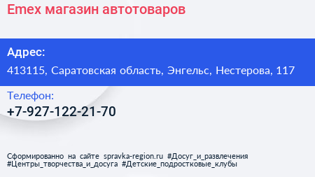 Emex, магазин автотоваров по адресу 413115, Саратовская область, Энгельс, Нестерова, 117 в дальнейшем Организация, размещена в следующих категориях:
