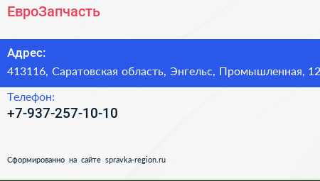 ЕвроЗапчасть по адресу 413116, Саратовская область, Энгельс, Промышленная, 12 в дальнейшем Организация, размещена в следующих категориях: