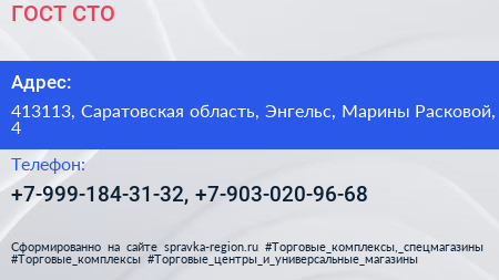 ГОСТ, СТО по адресу 413113, Саратовская область, Энгельс, Марины Расковой, 4 в дальнейшем Организация, размещена в следующих категориях:
