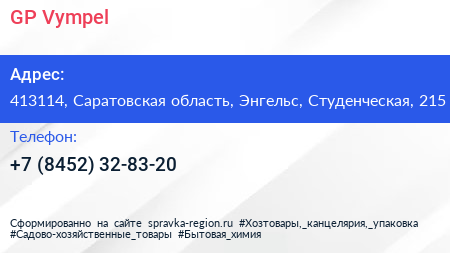 GP Vympel по адресу 413114, Саратовская область, Энгельс, Студенческая, 215 в дальнейшем Организация, размещена в следующих категориях: