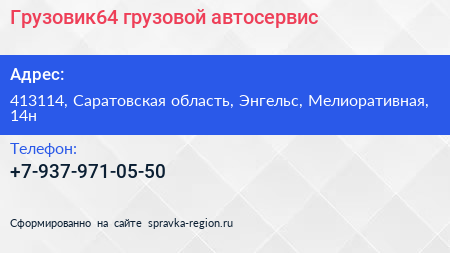 Грузовик64, грузовой автосервис по адресу 413114, Саратовская область, Энгельс, Мелиоративная, 14н в дальнейшем Организация, размещена в следующих категориях: