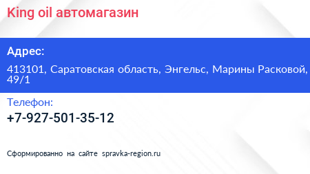 King oil, автомагазин по адресу 413101, Саратовская область, Энгельс, Марины Расковой, 49/1 в дальнейшем Организация, размещена в следующих категориях: