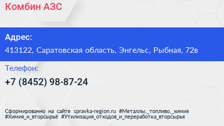 Комбин, АЗС по адресу 413122, Саратовская область, Энгельс, Рыбная, 72в в дальнейшем Организация, размещена в следующих категориях: