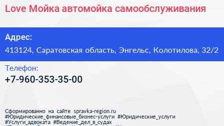 Love Мойка, автомойка самообслуживания по адресу 413124, Саратовская область, Энгельс, Колотилова, 32/2 в дальнейшем Организация, размещена в следующих категориях: