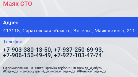 Маяк, СТО по адресу 413118, Саратовская область, Энгельс, Маяковского, 211 в дальнейшем Организация, размещена в следующих категориях:
