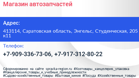 Магазин автозапчастей по адресу 413114, Саратовская область, Энгельс, Студенческая, 205 к11 в дальнейшем Организация, размещена в следующих категориях: