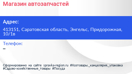 Магазин автозапчастей по адресу 413151, Саратовская область, Энгельс, Придорожная, 10/1в в дальнейшем Организация, размещена в следующих категориях: