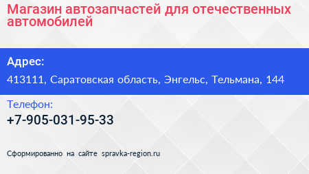 Магазин автозапчастей для отечественных автомобилей по адресу 413111, Саратовская область, Энгельс, Тельмана, 144 в дальнейшем Организация, размещена в следующих категориях: