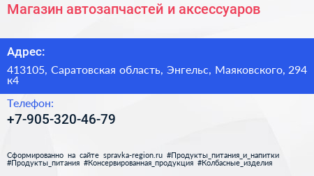 Магазин автозапчастей и аксессуаров по адресу 413105, Саратовская область, Энгельс, Маяковского, 294 к4 в дальнейшем Организация, размещена в следующих категориях: